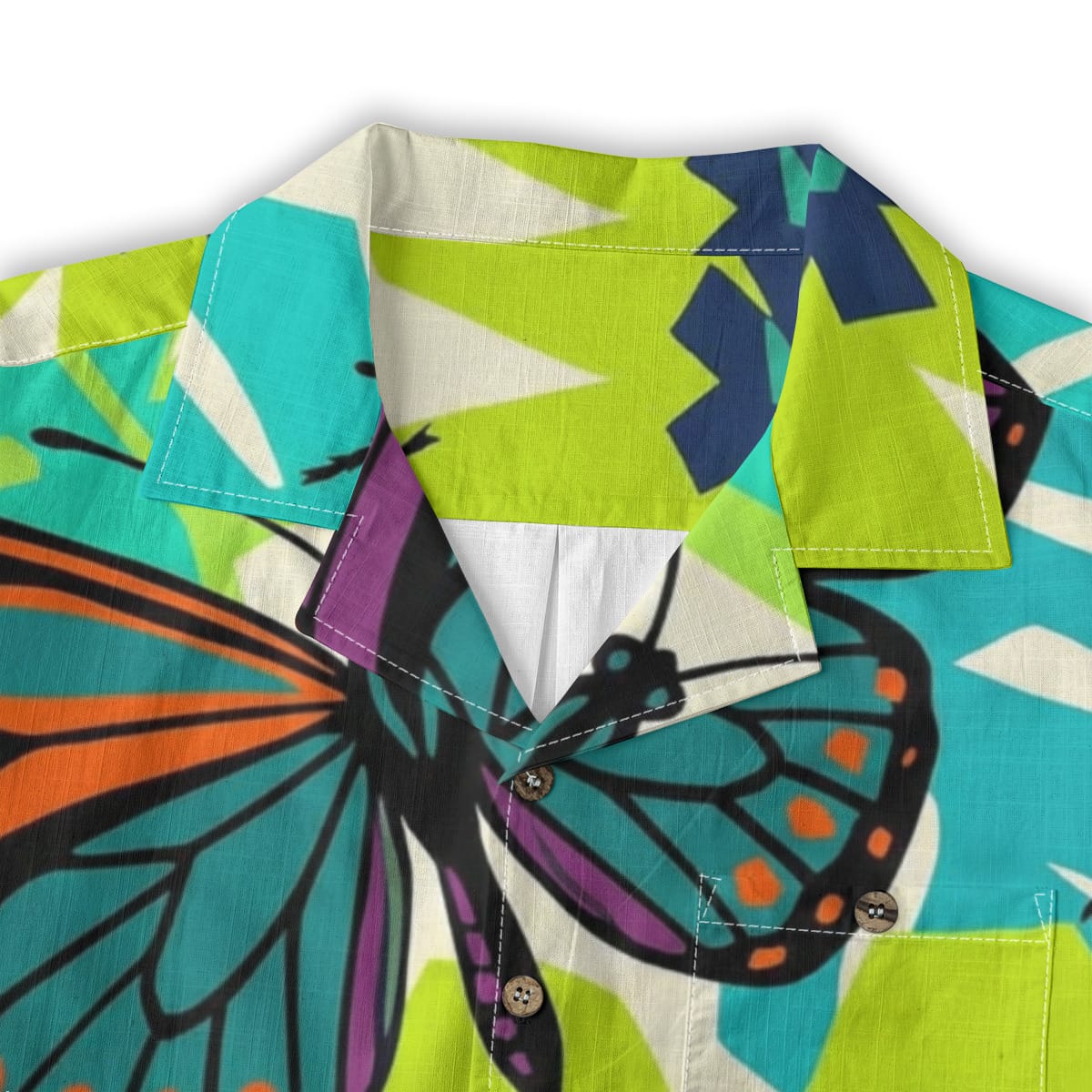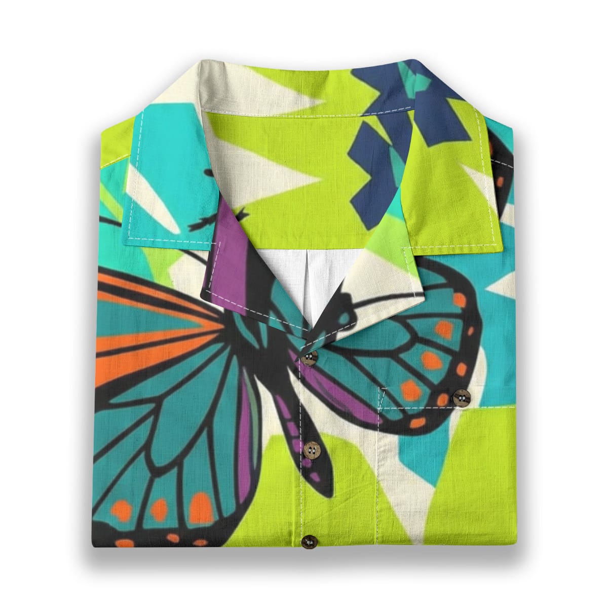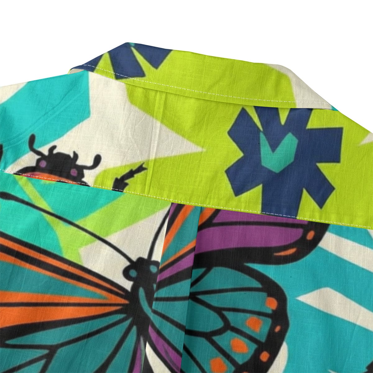 Stand out with confidence in this bold butterfly and beetle Hawaiian shirt inspired by modern abstract art.