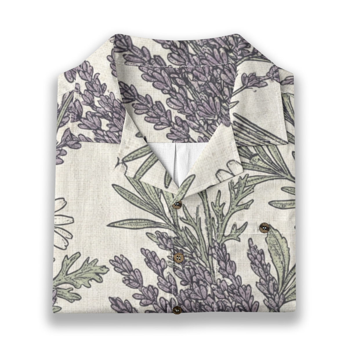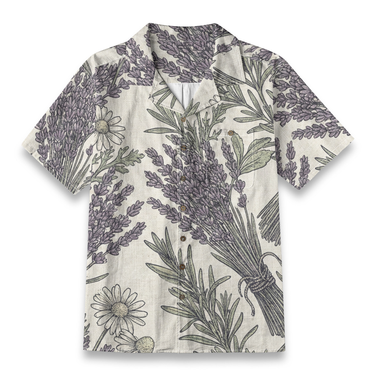 This Hawaiian shirt features a detailed botanical illustration inspired by lavender bundles and wild garden herbs.