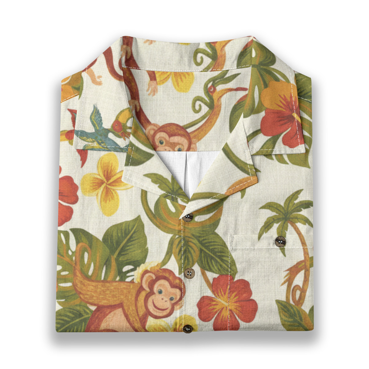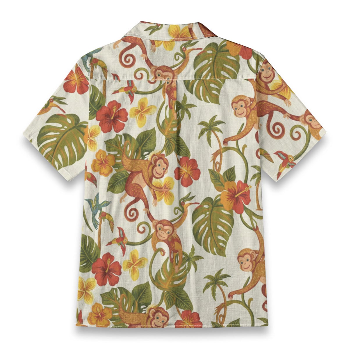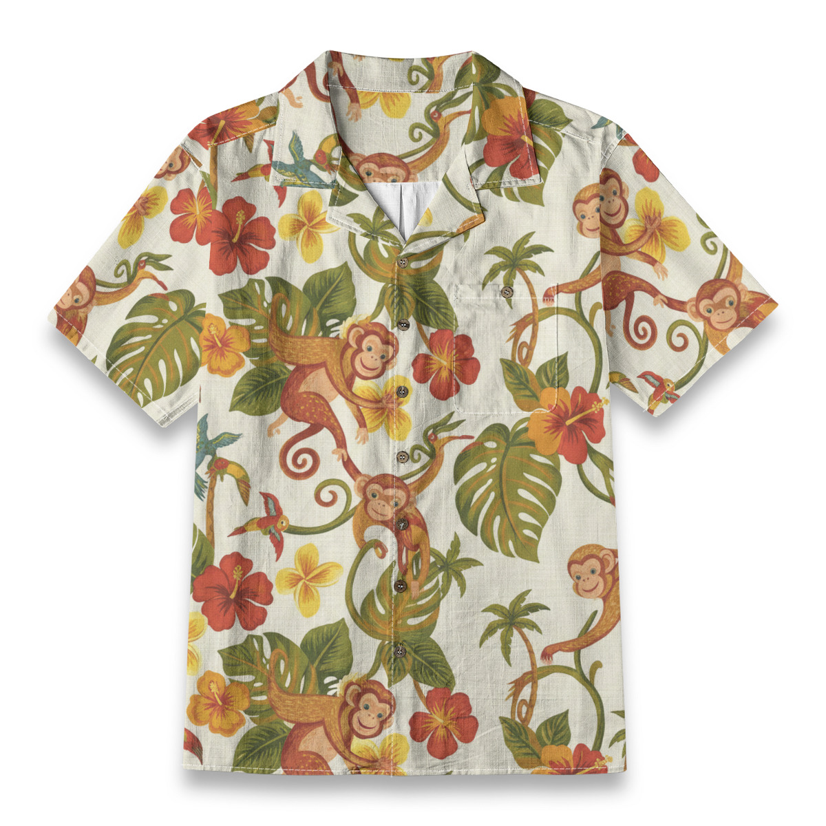 This Hawaiian Shirt features cheerful monkeys swinging through lush tropical leaves, colorful hibiscus flowers, and playful jungle details.