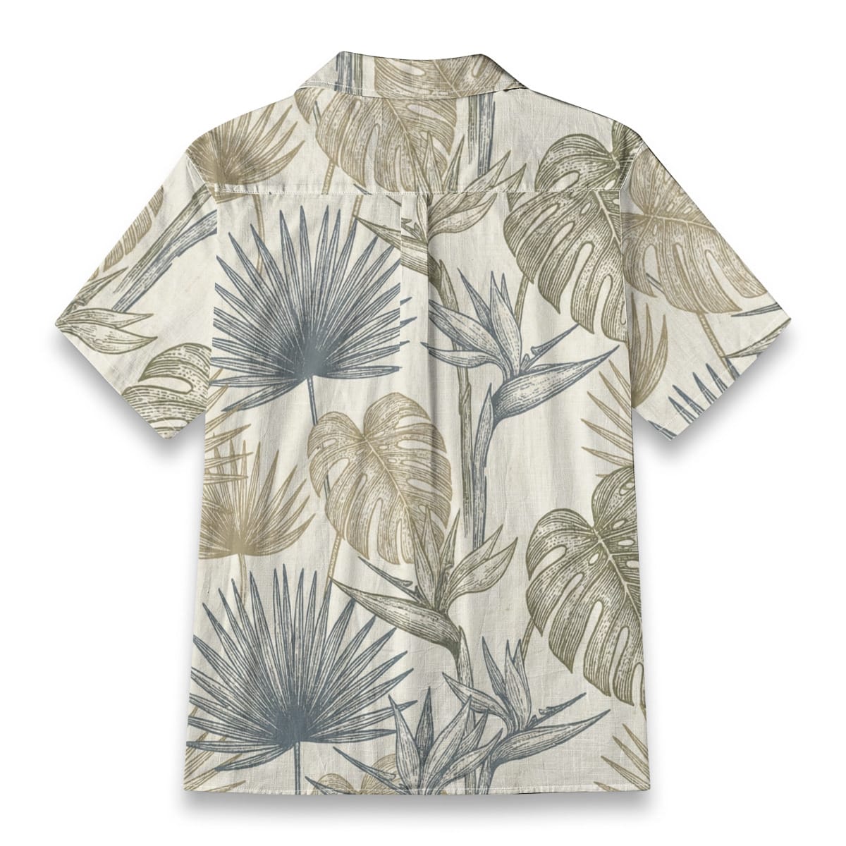 This Hawaiian shirt features an elegant botanical design inspired by tropical palms and monstera leaves.