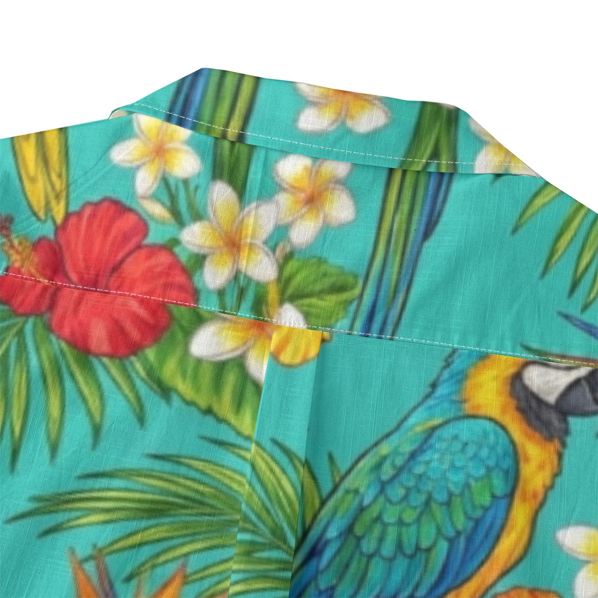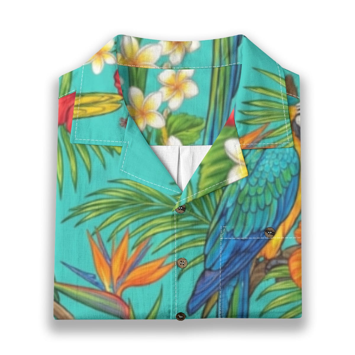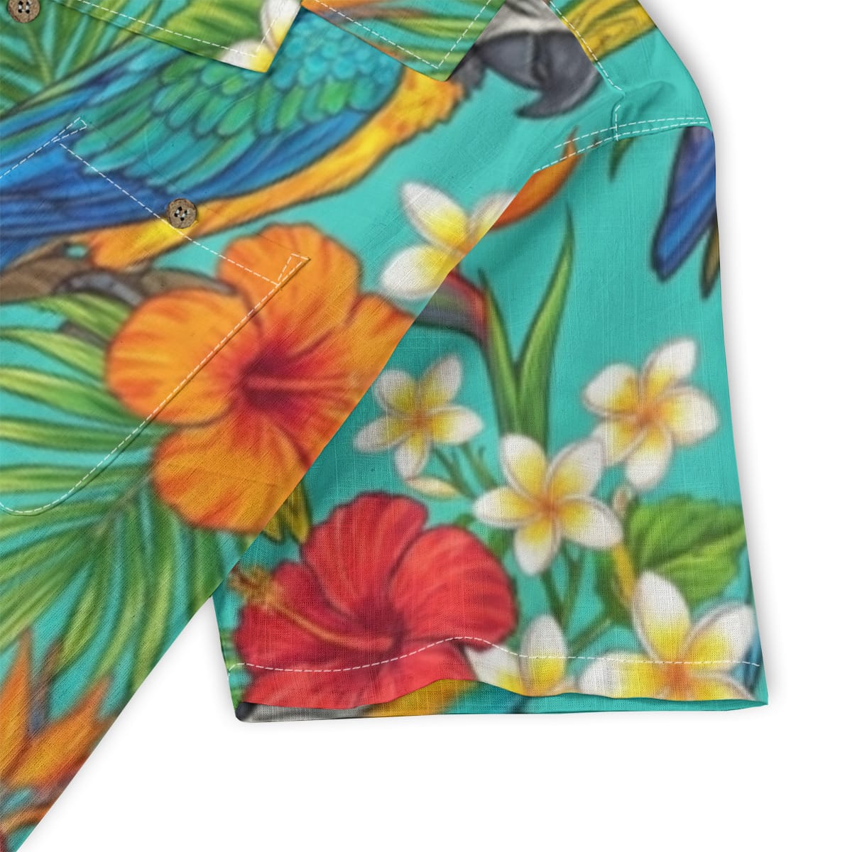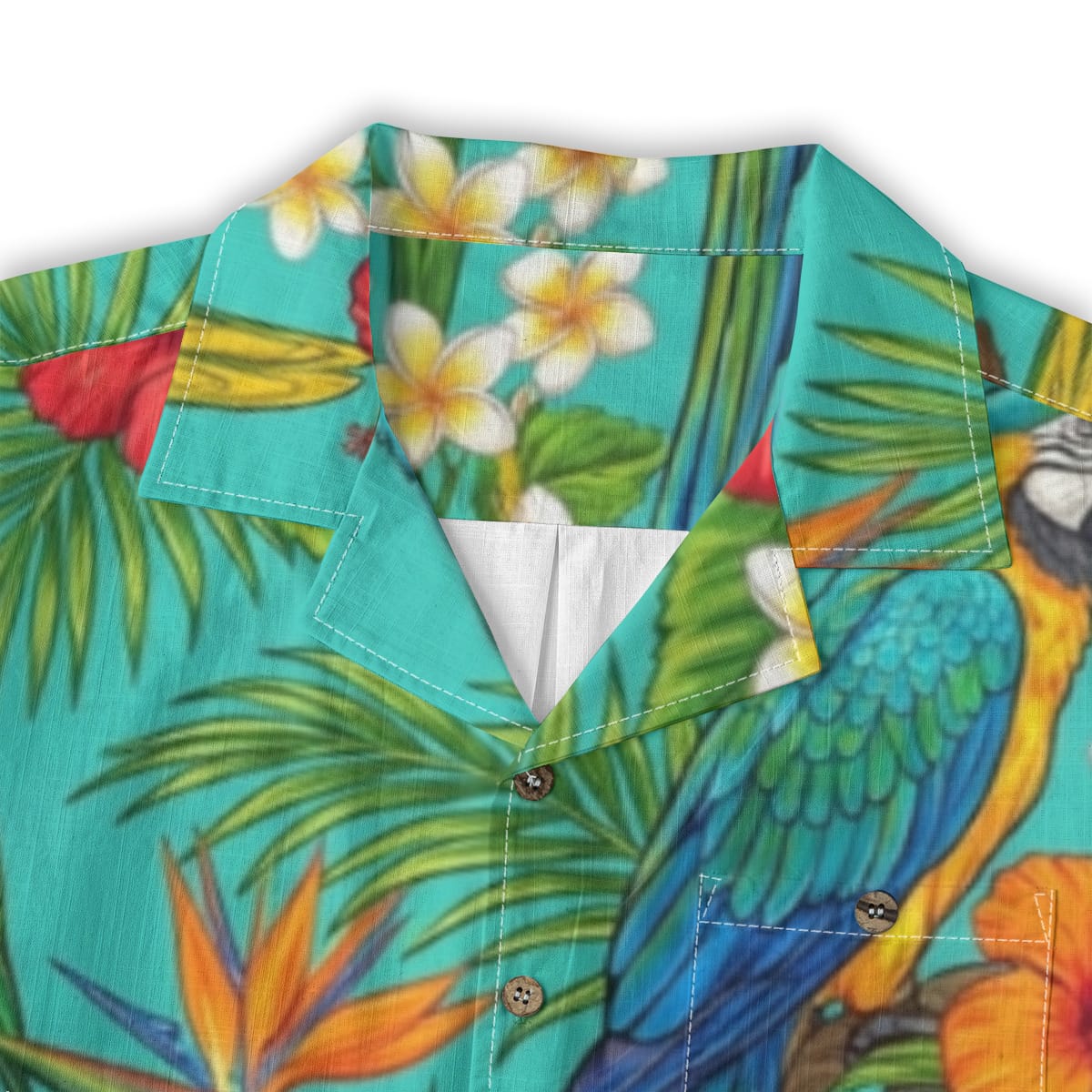 Turn heads with this vibrant tropical parrot Hawaiian shirt inspired by lush island scenery.