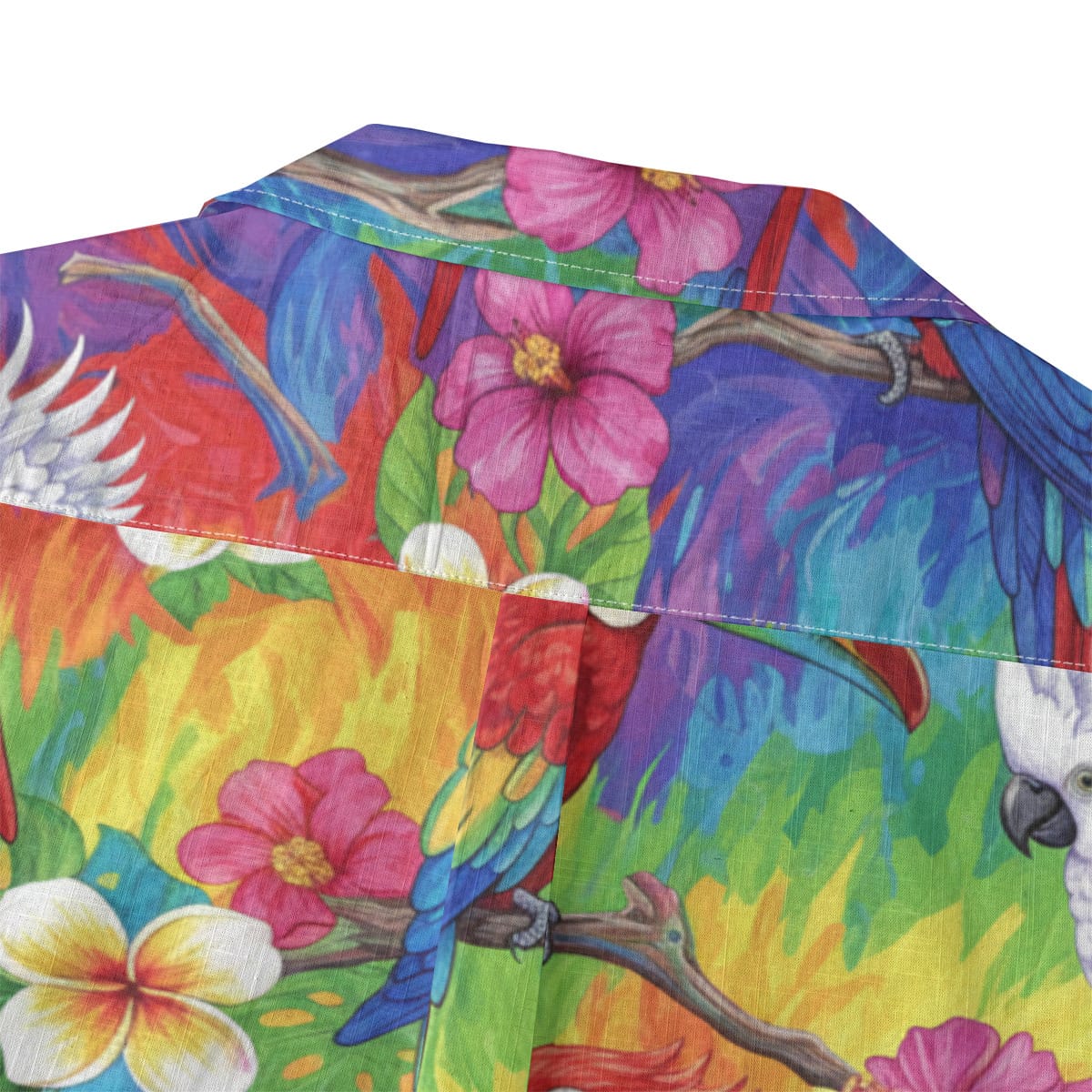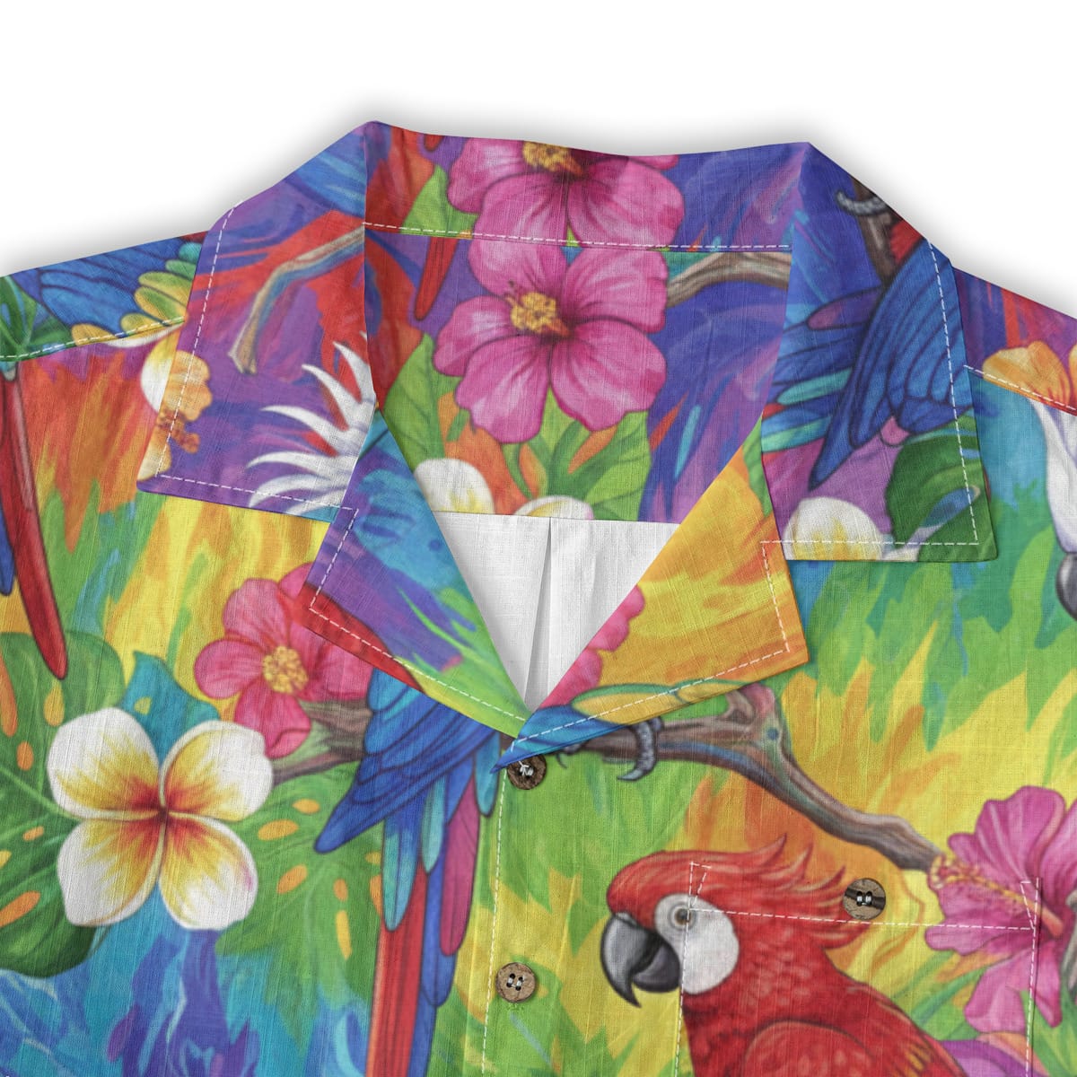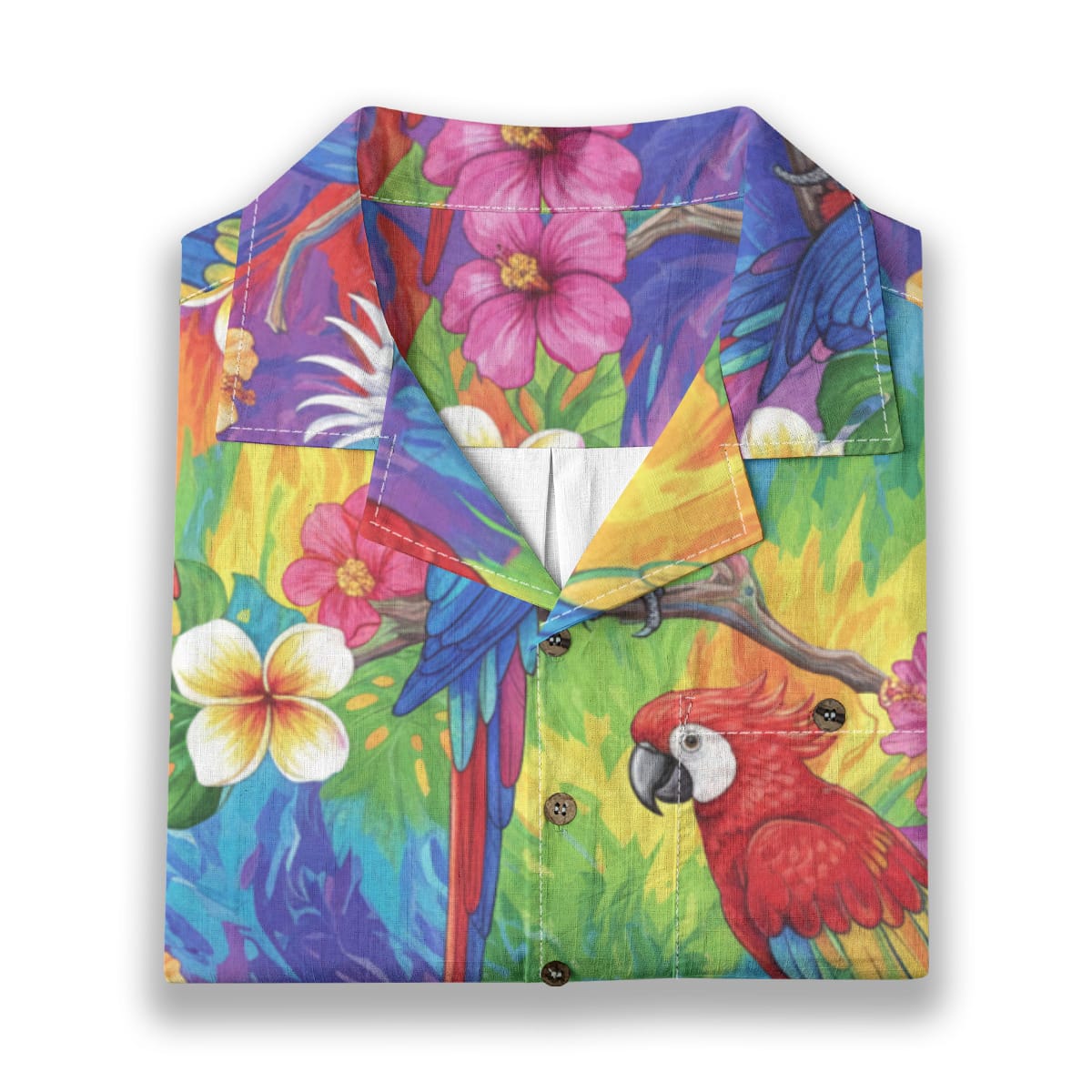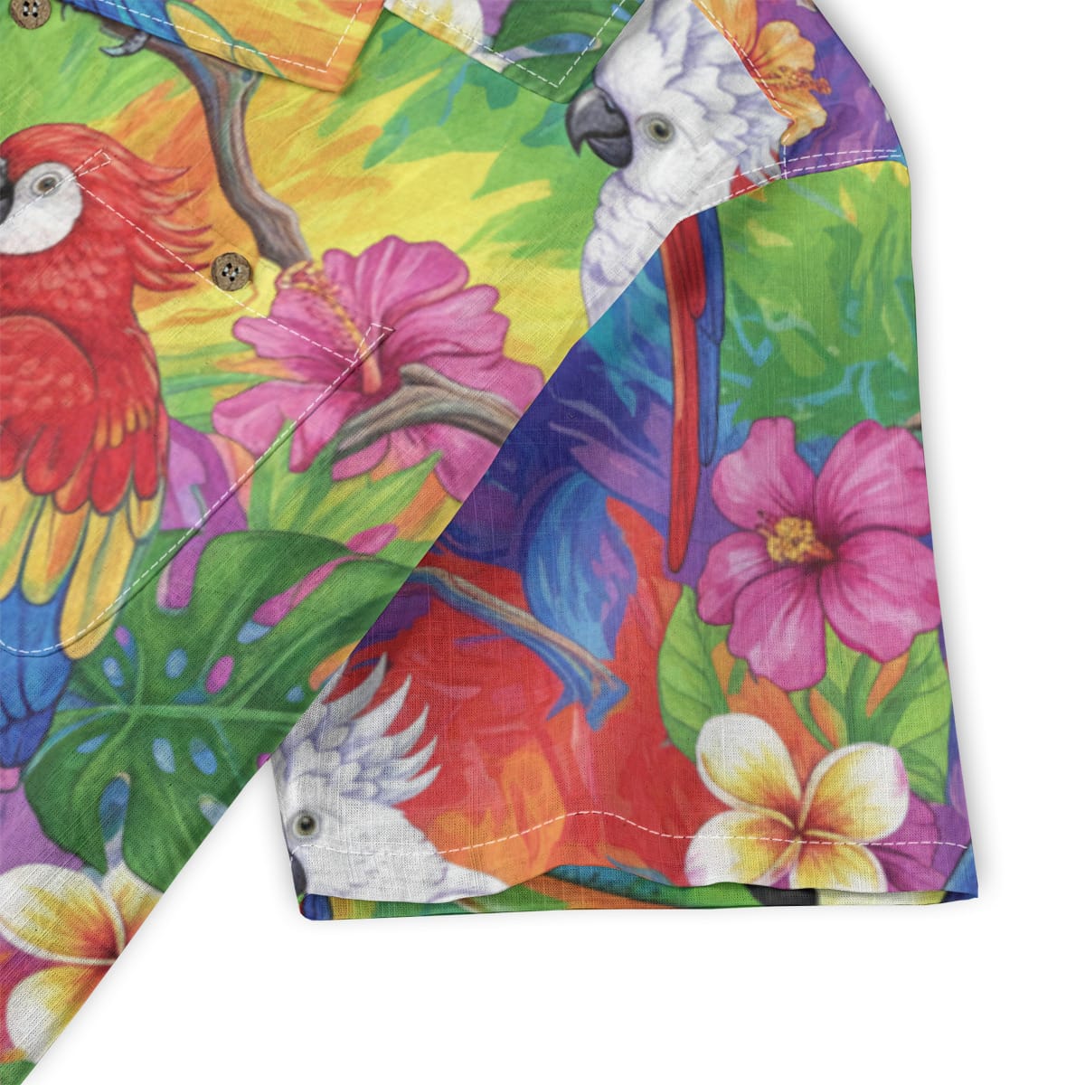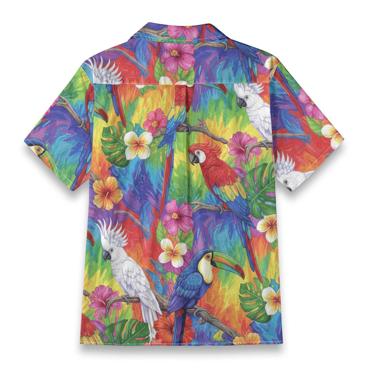 This Hawaiian Shirt bursts with color, featuring parrots, toucans, and cockatoos perched among lush tropical leaves and blooming flowers.
